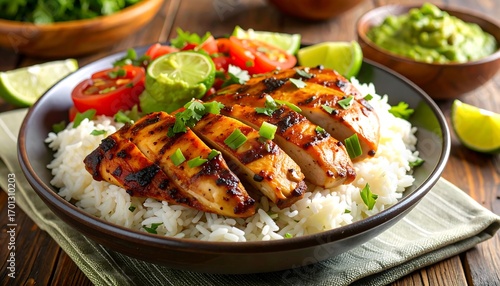 Grilled chicken breast with rice, a vibrant and flavorful meal featuring juicy, grilled chicken, atop a bed of fluffy white rice, garnished with fresh herbs.