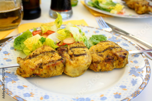 Grilled chicken fillet on metal skewer with salad
