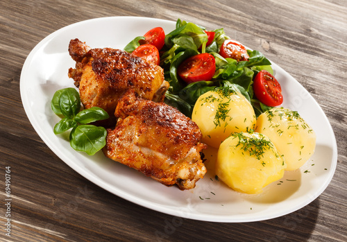chicken, leg, drumstick, food, dinner, meat, leg, thigh, thigh, grilled, boiled, potato, potato, fried, roast, roasted, poultry, vegetable, grill, calorie, diet, dieting, dining, dish, prepared, lunch, menu, salad, broiled, nourishment, healthy, plate, vegetable, meal, dinner, white, background, horizontal, portion, parsley, bar-b-q, tomatoes, lettuce, lamb, tomatoes, arugula