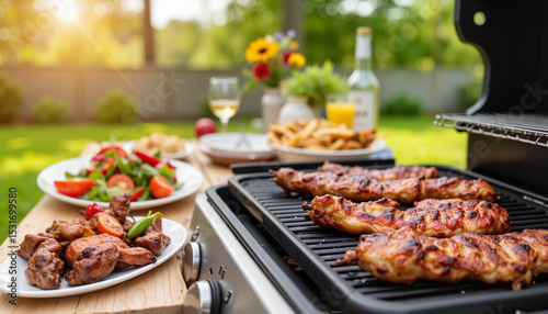 Grilled chicken pieces on a barbecue with side dishes outdoors