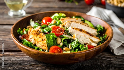 Grilled chicken salad in wooden bowl on rustic table for healthy fresh meal concept