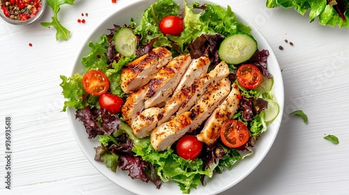 Grilled Chicken Salad on White Background Top Down Photo generative ai