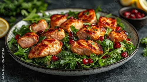 chicken, salad, pomegranate, grilled, greener, healthy, dinner, lunch, meal, food, meat, protein, diet, nourishment, delicious, fresh, cookery, epicure, eatery, receipe, cooking, arugula, lemon, cranberry, dark, background, table, plate, dish, culinary, snack, cafes, catering, party, celebration, summer, spring, healthy lifestyle, eating, wellness, vitamin, mineral, antioxidant, organic, farm, tasty, gourmet food, homemade