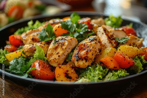 grilled, chicken, salad, tomatoes, cilantro, lettuce, meal, food, dinner, lunch, healthy, fresh, delicious, savoury, protein, vegetable, citrous, dish, plate, black, wooden, table, background, closeup, texture, juicy, flavorful, appetising, rustic, homemade, epicure, eatery, home, cooked, seasoned, spice, garnish, tasty, organic