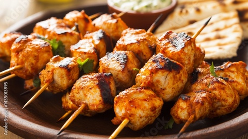 skewer, chicken, grilled, food, spicey, tasty, cookery, dinner, meal, bar-b-q, bar-b-q, lunch, protein, delicious, healthy, diet, receipe, eatery, cooking, hot, eat, nourishment, serving, plate, wooden, grill, marinade, sauce, dip, yogurt, pita, bread, fresh, party, summer, appetising, roasted, juicy, cube, flavorful