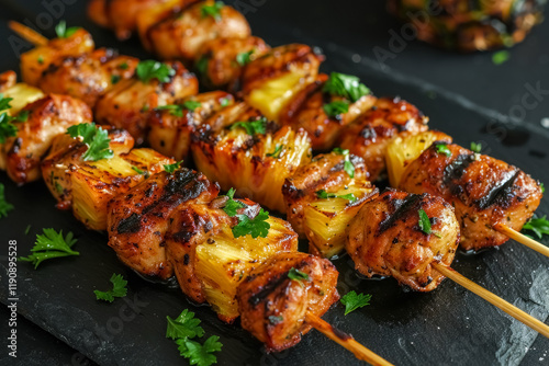Grilled chicken skewers with pineapple and fresh herbs on black slate platter