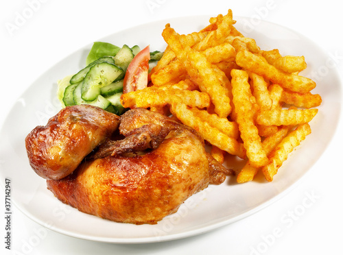 Grilled Chicken with French Fries and Salad Isolated on white Background