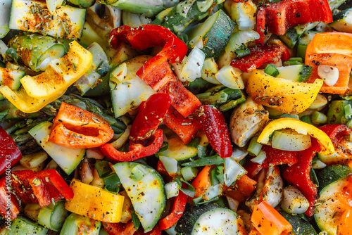 Grilled colorful vegetable bell pepper, zucchini, eggplant background. Vegan, seasonal, summer eating concept.