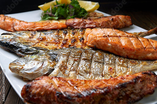 Grilled fish on a white plate with herbs and lemon, dorado, mackerel, salmon steak, salmon fillet, on a wooden board