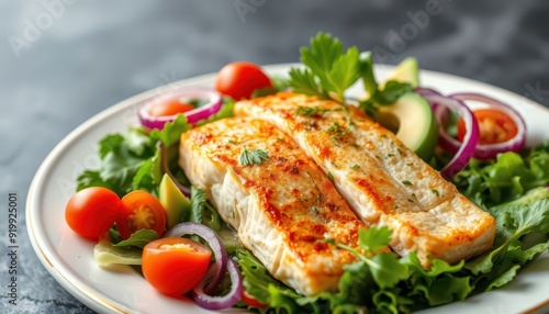grilled fish, fish, salmon, salad, vegetable, tomatoes, cherry tomato, red onion, avocado, lettuce, health food, healthy eating, diet food, protein, dinner, lunch, meal, food photography, eatery, cookery, food, delicious, tasty, fresh, appetising, home cooking, healthy lifestyle, nourishment, dietary, epicure