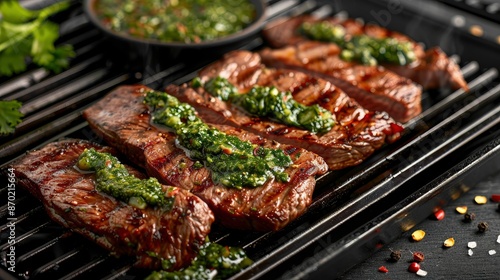 Grilled Flank Steak With Chimichurri Sauce On A Grill Pan, A Savory Dish