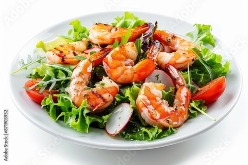 Grilled giant shrimp prawns salad on white background