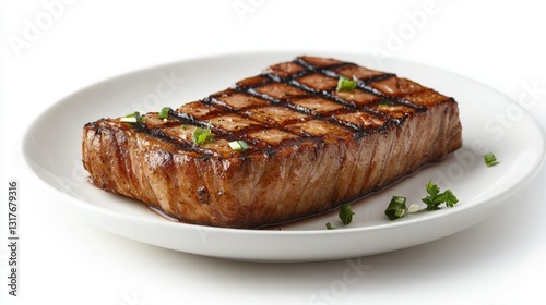 white background, seafood, culinary arts, fine dining, grilled fish, cooking, gastronomic, texture, main course, protein, savoury, presentation, delicious, nourishment, tasty