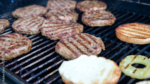 Grilled hamburger meat and buns with pineapple on stainless BBQ grill with flames on dark background. Food and cuisine concept.