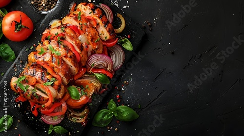 Grilled Italian sausages served with roasted bell peppers and onions on a dark rustic table. Warm lighting highlighting the textures and colors, creating an inviting and appetizing look. hd quality,