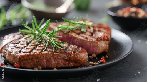 Grilled juicy steak meat on black plate with peppercorns and fresh rosemary branch