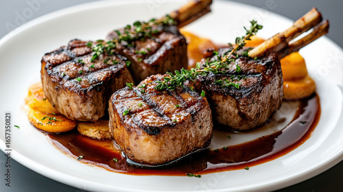 Grilled lamb chops served with rich red wine reduction and garnished with fresh herbs evoke