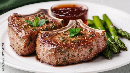 Grilled Lamb Chops with Mint Sauce and Fresh Asparagus on Plate