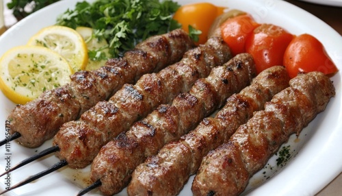 kebob, lamb, grilled, meat, food, dish, dinner, lunch, cookery, tasty, delicious, savoury, plate, white, lemon, slice, parsley, herb, garnish, vegetable, tomatoes, pepper, orange, red, yellow, juicy, skewer, cooking, bar-b-q, eatery, main, course, protein, healthy, aromatic, spicey, succulent, summer