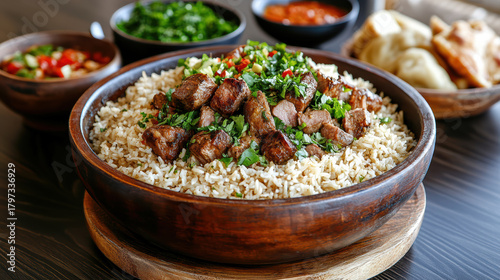 lamb, rice, grilled meat, herb, parsley, cilantro, brown rice, wooden bowl, salad, greener, savoury, aromatic, dinner, homemade, rustic, mediterranean, comfort food, festive, garnished, culinary, protein, table setting, closeup, food photography