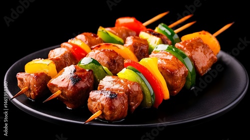Grilled meat and bell pepper skewers on a black plate. Delicious, savory, and colorful