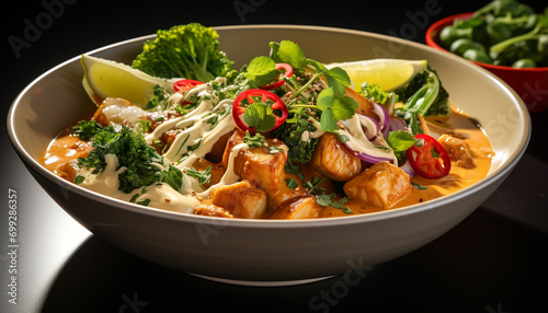 Grilled meat and vegetables, a healthy gourmet lunch option generated by AI