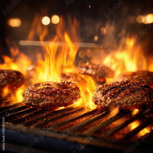 grilled meat patties being cooked on a flaming grill . aspect ratio 1:1