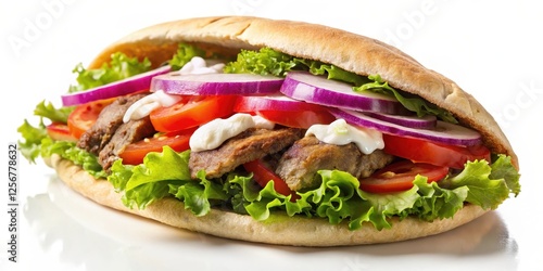 sandwich, meat, grilled, pita, bread, tomatoes, onion, lettuce, white, background, isolated, food, cookery, meal, lunch, dinner, eatery, cooking, ingredient, healthy, delicious, tasty, fresh, vibrant, closeup, photo, studio, shot, image, visual, graphic, composition, texture, colours, light, shadow, detail, object, product, gastronomy, appetising, eat, serving