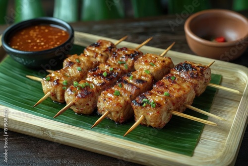 Grilled meat skewers garnished with herbs served on banana leaf with a side of dipping sauce on wooden tray