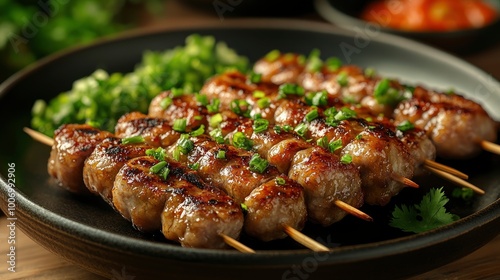 grilled meat, skewer, skewer, meat, grill, bar-b-q, bar-b-q, green onion, scallion, dinner, food, food photography, delicious, tasty, savoury, appetising, fresh, culinary, gastronomy, cookery, eatery, closeup, topview, still life, black plate, wooden table, epicure