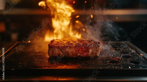 Grilled meat steak on stainless grill depot with flames on dark background Food and cuisine concept