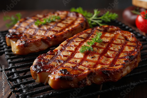 Grilled meat steaks with herbs on sizzling grill background copy space