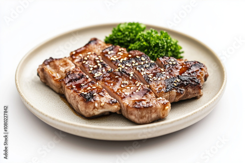 grilled meat, sesame seeds, savoury, plate, food photography, closeup, garnished, texture, delicious, meal, epicure