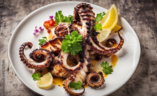 Grilled Octopus with lemon and cilantro, Tender smoky octopus grilled to perfection enhanced by zesty lemon and fresh cilantro, creating a flavorful and refreshing seafood dish.