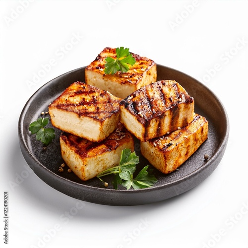 Grilled paneer cubes on white background