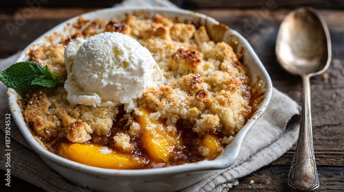 food, sweet, dessert, fruit, homemade, delicious, baked, peach, fresh, pastry, epicure, cake, cobbler, pie, healthy, tasty, summer, dish, crumble, organic, cooked, ripe, crust, yellow, breakfast, orange, american, crisp, treat, rustic, snack, cream, wooden, prepared, portion, cinnamon, background, juicy, sugar, warm, baking, natural, white, cookery, closeup, table, spoon, vanilla, nobody