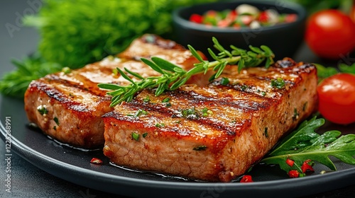 Grilled pork chops, herbs, salsa, close-up. Food photography for menus