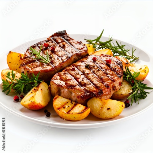 Grilled pork steak with roasted apples and rosemary sprigs presentation on white background