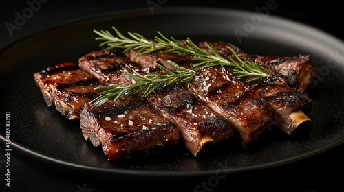Grilled ribs garnished with rosemary and sea salt on a black plate.