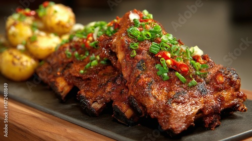 rib, grilled, potato, green onion, food, meat, dinner, lunch, plate, culinary, cookery, delicious, tasty, epicure, meal, cooked, roasted, bar-b-q, bar-b-q, scallion, herb, garnish, appetising, studio shot, closeup, eatery, serving, presentation, brown, green, red, yellow, black, healthy, nourishment, diet, protein, side dish, main course, food photography