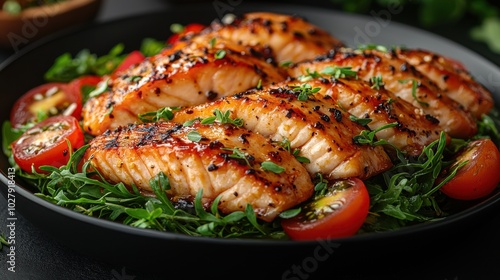 Grilled salmon fillets served on a bed of fresh greens and cherry tomatoes during a summer dinner
