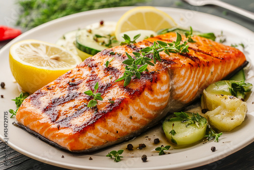 salmon, grilled, fish, seafood, herb, lemon, garlic, fillet, healthy, dinner, epicure, protein, cooked, fresh, seasoning, tasty, thyme, parsley, closeup, diet, meal, rustic, roasted, nourishment, marinated, baked, delicious, epicure, appetising, culinary, elegant, juicy, lunch, seared, texture, garnished, favor, wholesome, mediterranean, beautiful
