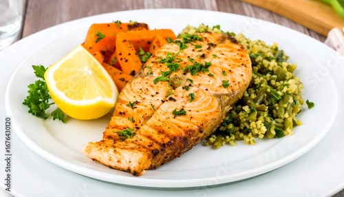 salmon, grilled, carrot, roasted, rice, green, healthy, plate, food, dish, meal, cooked, dinner, vegetarian, protein, cookery, delicious, eatery, image, epicure