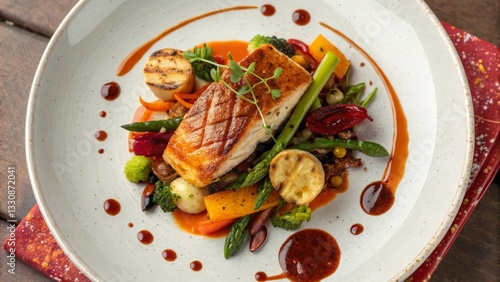 epicure, fine dining, health food, culinary, cookery, delicious, dinner, lunch, healthy eating, fish, vegetable, asparagus, broccoli, carrot, courgette, garnish, sauce, plate, elegant, appetising, culinary arts, food photography, meal, cooked, balanced diet