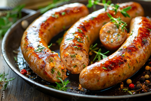 Grilled sausages on pan with herbs and spices, wood background, close up.