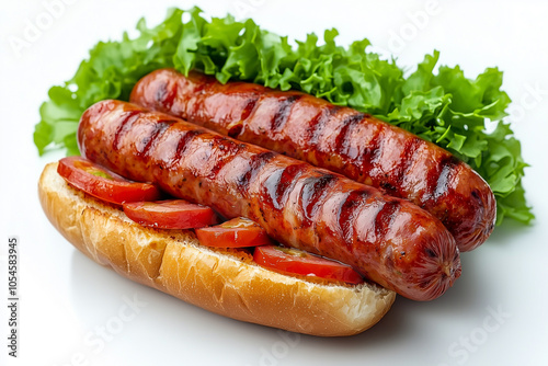 Grilled sausages, tomato slices, lettuce on bun, isolated on white background.