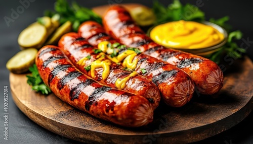 Grilled Sausages with Mustard and Pickles on Wooden Board
