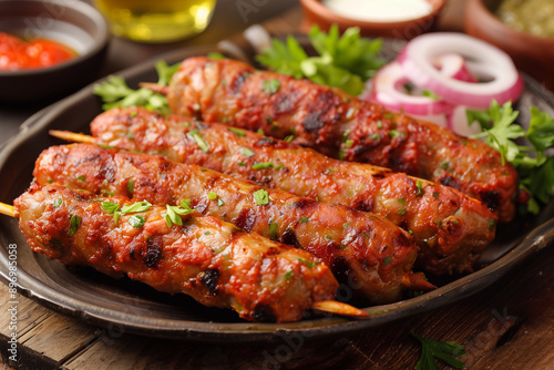 Grilled shish kebab, arabic kofta. Kofte kebab from mince lamb and beef meat on Skewer.