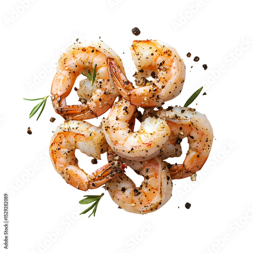 shrimp, seafood, cookery, culinary, food photography, food, delicious, dinner, receipe, cooking, grilled, seared, pepper, black pepper, rosemary, herb, aromatic, spice, favor, tasty, epicure, eatery, menu, dish, white background, isolated, closeup, topview, gastronomy
