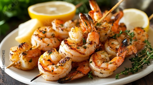 grilled shrimp on wooden skewers on a plate nacro horizontal